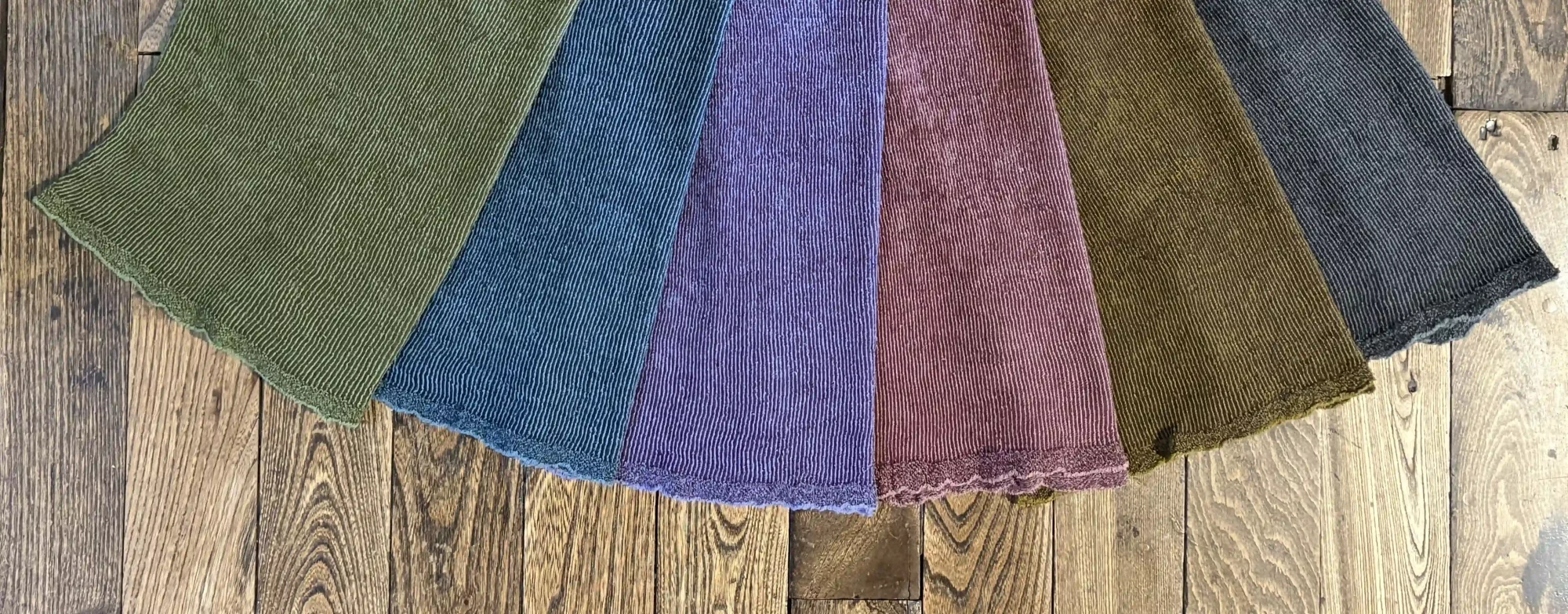 From left> V:Beige Y:Mustard B:Blue F:Purple H:Gray